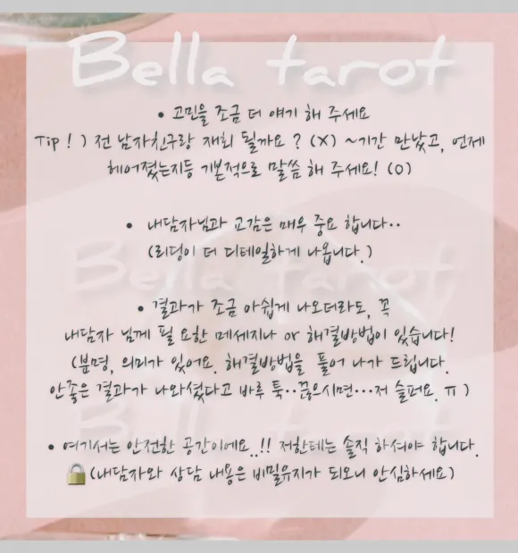 저는, 더 이상 피할수 없었으며 “운명이 허락하는 동안, 즐겁게 지내라” 이 말을 믿어야만 했습니다.혼자서 감당하기 어려운 마음,어디에도 털어놓지 못한것들 .. 갈림길에 서 계실때, 감당하기 어려우실때좋은 길로 안내 해드릴게요.🌙 좋지 않은리딩이 나오더라도 조금 더 현명한 선택과 좋은 방향으로 도와드릴게요. 🪄예쁜 후기 남겨 주시면 저와 인연을 맺으신 분께 감사한 마음으로 초기도 올려드리겠습니다.__ 🕯️🧧