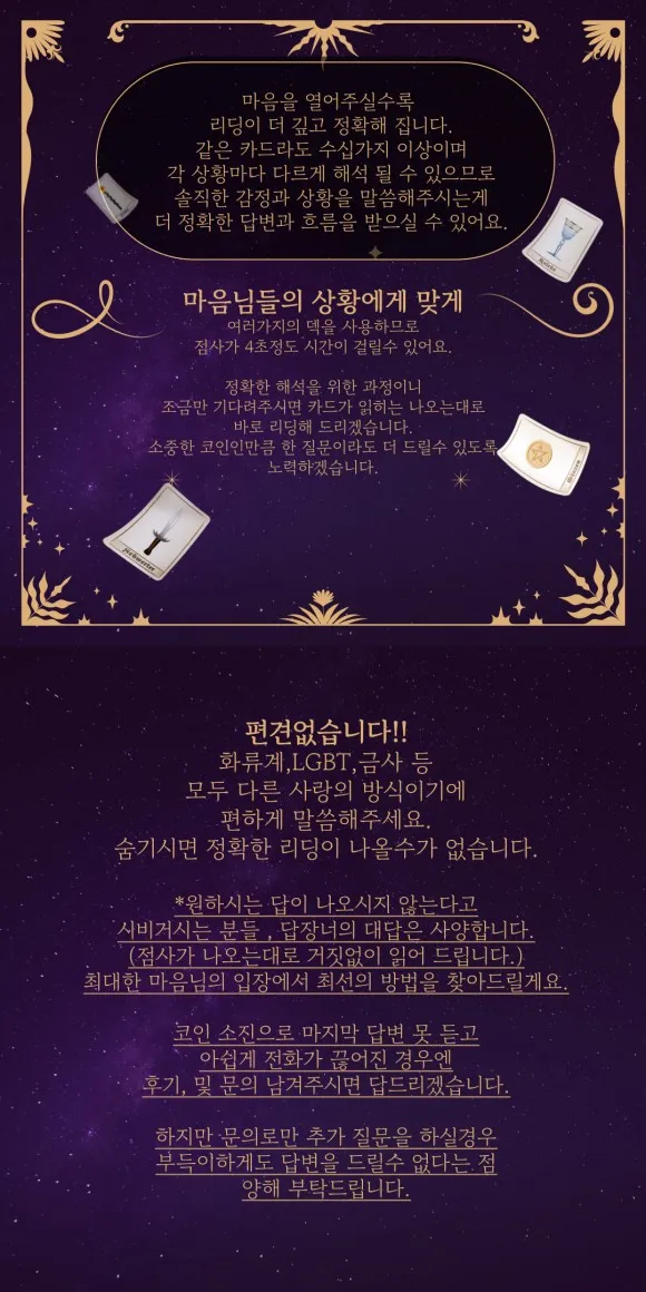 리딩은 단순한 예언이 아니라 감정과 흐름을 읽어내는 과정입니다.