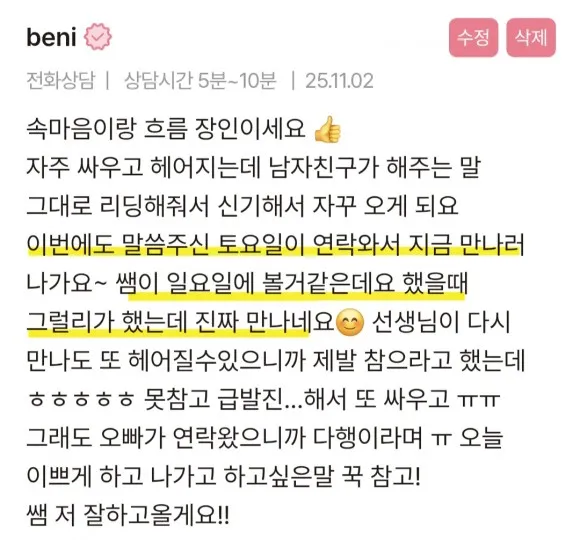 이 상담을 통해 많은 분들이 자책을 내려놓고, 비로소 자신을 다독이며 다시 걸어나가게 되었죠.